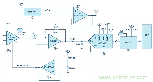 圖1中的電路顯示了帶有2.5MSPS和上游可編程儀表放大器的16位SAR轉換器,它將增益設置為1或100。通過在FPGA中進行過采樣和數字信號處理,該電路可實現大于125dB的動態范圍,并且仍然非常安靜。高動態范圍是通過AD8253的自動切換和過采樣實現的,其中信號的采樣速率遠高于奈奎斯特頻率。