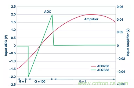 除模擬路徑中的組件外,FPGA(或處理器)對電路性能也很重要。關鍵任務是將儀表放大器的增益從1切換為100。為此,對許多閾值進行了編程以確保ADC不飽和。因此,AD8253在輸入電壓高達20mV左右時以100為增益運行,這使得ADC輸入端的最大電壓達2.0V。然后,FPGA將AD8253的增益降至1且沒有延遲,以防止過載(見圖3)。