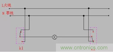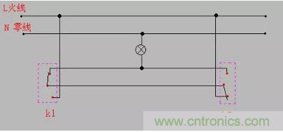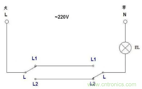 【導讀】不管幾個開關控制一個燈,都是開關控制火線的通斷,所以零線是直接接燈的。這種是最常規的接法,兩個單聯雙控開關的L一個接火線一個接燈的控制線,兩個開關上的L1和L2同名的連一起。