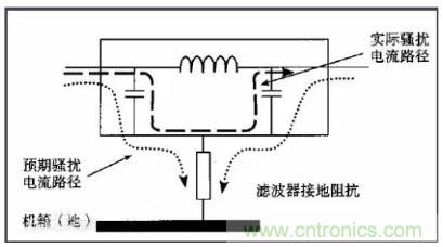 這種情況也比較普遍。許多工程師安裝濾波器時(shí),濾波器的殼體和機(jī)箱之間搭接不良(有絕緣漆);同時(shí),使用的接地線較長(zhǎng),這將導(dǎo)致濾波器的高頻特性變壞,降低濾波性能。