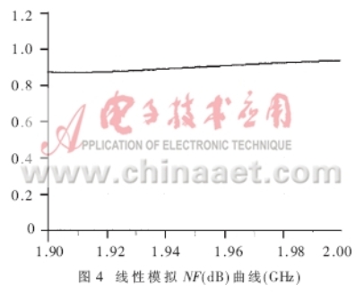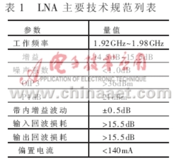 為使圖2中的LNA模塊噪聲系數。截點和增益達到表1中的各項指標,設計漏極電流Id=60mA?同時,要求單個放大元件在此偏置點的工作性能達到優于表1的規范值。由于E-pHEMT元件ATF-54143在電流Id=60mA下,具有最佳的截點(IP3)和最小噪聲系數Fmin;漏源極電壓Vds為3V時,具有稍高的增益;偏置是+5V穩定電壓,所需單極性+3V電壓更具有優勢,因此選擇其作為放大元件。