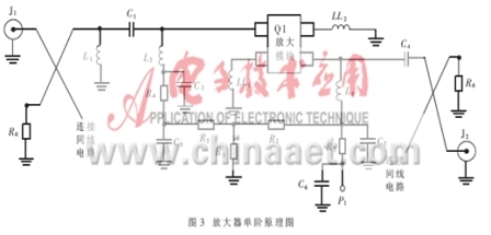 因規范要求NF最大值只有1dB,為實現放大器的最佳噪聲匹配,網絡采用高通阻抗匹配。放大電路原理圖如圖3所示,它的輸入匹配網絡由一個串聯的電容C1和兩個并聯的電感L1和L2組成。因電路損耗將直接與噪聲系數相關,這樣L1和L2的高Q值則變得非常重要。短路電感L1能夠在低頻端提供增益衰減,同時又與C1一起作為輸入匹配阻抗的一部分,C1同時要作為直流隔斷電容。L2還要為pHEMT做偏置電感,在柵極加入電壓偏置,它要求有一個好的旁路電容C2。這個網絡是對于低噪聲系數。輸入回波損耗和增益都加以兼顧考慮的方案,電容C2。C4保證帶內的穩定性,低頻端電阻R3。R4作為阻性終端以保證低頻時系統的穩定性。輸出高通匹配網絡由C4和L3組成,分路電感L3的作用與L2相同,作為pHEMT管偏置載入電感,在漏極偏置。