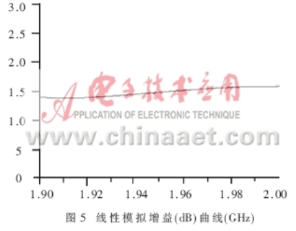 除了能夠得出增益、NF、P1dB和輸入輸出回波等重要參數外,軟件模擬還能夠得出關于電路設計穩定性的信息。它是電路能否正常工作的重要前提。模擬軟件計算Rollet穩定性因子K和作穩定性圓是兩種很容易做到的方法,它們可以明確地表示出穩定性的數據。圖7示出的Rollett穩定因子K的模擬值(K>1)表明:在1.9~2.0GHz工作帶寬范圍,電路能夠實現無條件穩定。