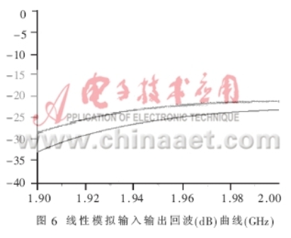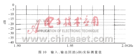 得到了完整的電路PCB板后,就要實際測量電路的各個參數,驗證設計的仿真結果是否與之相符,是否最終符合表1的設計技術規范。本文所采用的測試儀器是HP8753ES網絡分析儀和HP8970B噪聲儀。圖8、圖9表達出放大器實測的NF和增益曲線,在帶寬為0.1GHz的頻率范圍內NF的值在0.8dB和1.0dB之間,增益在1.97GHz達到最大值15.5dB,在1.99GHz達到了15.3dB。由于NF是在實際PCB板外腔體內測得的,包含了同軸連接器的損耗和二級噪聲損耗,其測量指標表明實際的電路NF特性要稍差于模擬特性。圖10是輸入、輸出的回波曲線。當頻點在1.96GHz時,輸入回波為18dB,輸出回波達到22.5dB,放大器的OIP3在直流偏置Vds=3V,Id=60mA時測得值為37dBm,P1dB為21.4dBm。電路在較低的偏置狀態下Vds=3V,Id=40mA放大器的NF和增益都沒有降低,只有OIP3測出下降為36.5dBm。