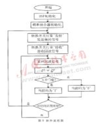 軟件流程如圖5所示。系統開始工作后,DSP初始化,FPGA配置頻率綜合器ADF4127L,產生精準的頻率源。詢問機轉換開關指向發射位置,發射單元發射詢問脈沖信號,經過一段時間后,開關指向接收位置,接收單元接收回波信號,先進行A/D采樣,并將I路和Q路的采樣值平方相加,若大于編碼門限,則判定當前碼為1,否則為0。一幀32位識別碼判別完后,詢問單元重新發出詢問信號,如此循環。解調出的識別碼通過串口送給外部設備,以供處理。