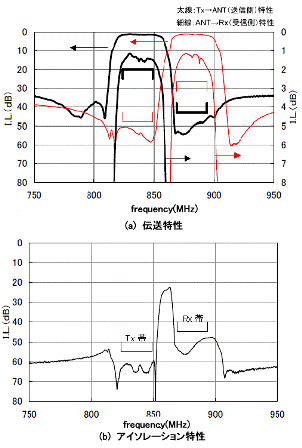 第二個例子,以圖2的BAND1(2GHz)收發(fā)雙工器(產(chǎn)品尺寸3.0×2.5×1.1mm)的特性為例。將特殊的設(shè)計技術(shù)引入到表面波難以實現(xiàn)低損耗的BAND1(2GHz)中來,在得到實際使用所需的隔離度的同時,還能實現(xiàn)Tx損耗1.4dB 和Rx損耗1.8dB這樣杰出的低損耗特性。一直以來,介質(zhì)收發(fā)雙工器在BAND1(2GHz)頻帶曾一度占據(jù)了主流的地位,而目前表面波做到了不亞于它的損耗值。由此,表面波收發(fā)雙工器替代了介質(zhì)收發(fā)雙工器成為了當(dāng)今主流。