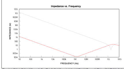 圖1.放大器的電源線會拾取RF信號。圖中數據表明1μF電容的對地阻抗低于10pF的阻抗,提供更好的噪音抑制能力