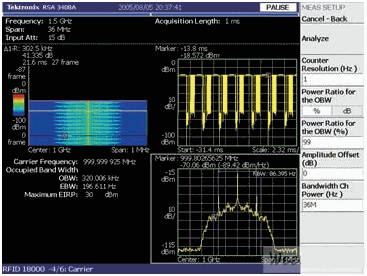 政府規(guī)定要求控制發(fā)射信號(hào)的功率、頻率、帶寬。這些規(guī)定防止有害干擾并保證每個(gè)發(fā)射者都是頻帶內(nèi)其他用戶的友好鄰居。對(duì)于許多頻譜分析儀特別是通常用于脈沖信號(hào)能量測(cè)量的掃頻頻譜分析儀,進(jìn)行此類測(cè)量是具有挑戰(zhàn)性的。RTSA 能夠分析一個(gè)完整的分組發(fā)射過程的能量特點(diǎn),也能直接測(cè)量跳頻信號(hào)的載波頻率,而無需將信號(hào)置于一個(gè)跨度的中心。按一下按鍵,分析儀就能識(shí)別一個(gè)瞬時(shí) RFID 信號(hào)的調(diào)制方式并能夠?qū)β省㈩l率和帶寬進(jìn)行監(jiān)管測(cè)量,使預(yù)一致性(pre-compliance)測(cè)試過程變得非常靈活和方便 [參閱圖2]。預(yù)一致性測(cè)試有助于確保產(chǎn)品一次通過一致性測(cè)試,而無需重新設(shè)計(jì)和重新測(cè)試。