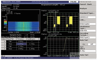 預(yù)編程測(cè)量能減少進(jìn)行這些測(cè)試所需的建立時(shí)間。例如,ISO18000-6 C 類型的一個(gè)重要測(cè)量是啟動(dòng)時(shí)間和關(guān)閉時(shí)間。載波能量上升時(shí)間必須足夠快以保證標(biāo)簽采集到使其正常工作的充足能量。信號(hào)也必須迅速達(dá)到穩(wěn)定狀態(tài)。發(fā)射結(jié)束時(shí),載波能量下降時(shí)間必須足夠快,以防止其他發(fā)射受到干擾 [參閱圖3]。