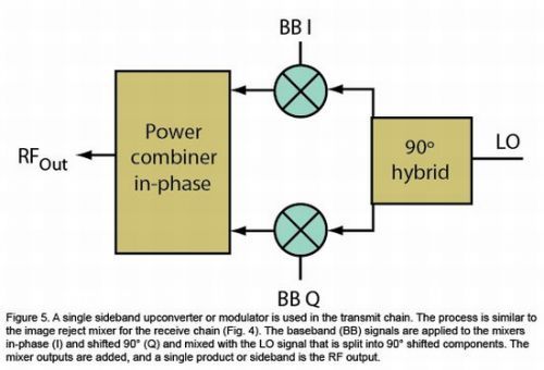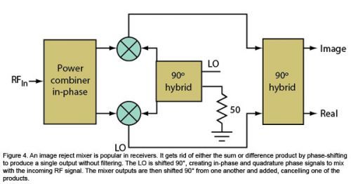 圖4:鏡像抑制混頻器在接收器中最受歡迎。它可以通過相移去掉和頻或差頻產物,產生單個輸出,而不需要濾波。LO進行90°相移,產生同相和正交相位信號,與輸入的RF信號進行混頻。然后混頻器輸出互相進行90°相移,從而去掉部分產物。