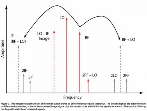 圖3:混頻器輸出的頻譜圖顯示產生的所有不同產物。需要的信號為和頻或差頻,不過請注意,有害鏡像信號和二階和三階信號為諧波的結果。濾波有助于減少這些有害信號。