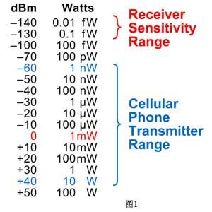圖1給出了dBm的值及其相應的瓦特數其中還給出了移動電話的發射機發射功率參考范圍以及靈敏接收機所能檢測到的最低信號功率[page]