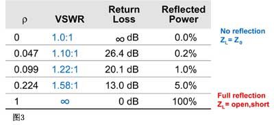 如果某個信號波從一種特征阻抗傳輸到另一種不同的特征阻抗,那么就會引起信號反射和反向傳輸。如果阻抗相同,就不會發生反射。當由于阻抗不連續而發生信號發射時,就會在傳輸線的兩個方向上出現信號波的傳輸。在這兩個波相位相同的點上,將出現最大的電壓幅值Vmax;在它們相位相差180度的點上,將出現 Vmin。Vmax和Vmin的比值稱為電壓駐波比,即VSWR。VSWR是衡量某個連接器或某條線纜的阻抗是否接近50歐姆的一個指標。圖3給出了理想情況下全匹配(沒有反射)、理想開路(100%反射),以及極端情況下這三個值之間的關系。