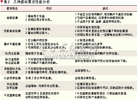 以上這些算法都是對主用戶發(fā)射端信號的直接檢測,基本都是從經(jīng)典的信號檢測理論中移植過來的。此外,近期一些文獻從主用戶接收端的角度提出了本振泄露功率檢測和基于干擾溫度的檢測。有些文獻對經(jīng)典算法進行了改進,如文獻[2]提出了一種基于能量檢測-循環(huán)特征檢測結(jié)合的兩級感知算法。文獻[3]研究了基于頻偏補償?shù)钠ヅ錇V波器檢測、聯(lián)合前向和參數(shù)匹配的能量檢測、多分辨率頻譜檢測和基于小波變換頻譜檢測等。表2歸納了文獻中提及較多的一些感知算法,并對其優(yōu)缺點進行了比較。