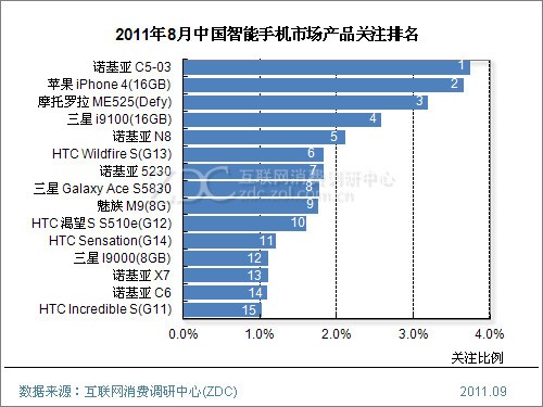 (圖)2011年8月中國智能手機市場產品關注排名