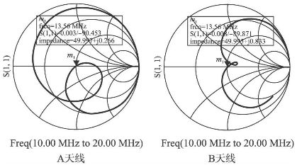 在載波頻率為13. 56 MHz時,通過在TX1 和TX2 兩點測量天線線路的反射系數(即參數S11 )來手動調諧,直到天線電路的輸入阻抗達到目標,計算方程如下: