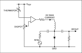 有些系統(tǒng)可能需要進(jìn)行溫度補(bǔ)償(圖3),簡(jiǎn)化電路中,數(shù)字電位器IC建立固定或可調(diào)偏置電平,熱敏電阻提供溫度輸入。這兩個(gè)輸入連接到運(yùn)算放大器,產(chǎn)生的輸出通過(guò)一個(gè)電阻驅(qū)動(dòng)PIN二極管。