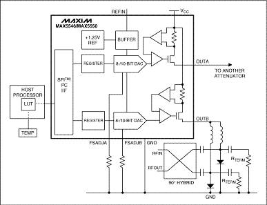 圖4. RF衰減器受電流輸出DAC (MAX5548或MAX5550)驅(qū)動(dòng),