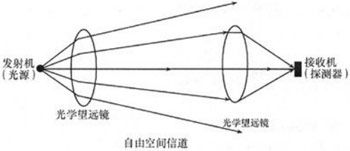 一個光無線通信系統構成如圖1所示,包括三個部分:發射機、信道和接收機。光發射機的光源受到電信號的調制,并通過作為天線的光學望遠鏡,將光信號經過空間送到接收端的望遠鏡。高靈敏度的光接收機,將望遠鏡收到的光信號再轉換成電信號,值得注意的是,發送端和接收端之間,必須是互相視線可見的,兩終端之間不能有阻擋。由于大氣空間對不同光波長信號的透過率有較大的差別,可以選用透過率較好的波段窗口。光無線系統通常使用0.85μm或1.5μm紅外波段。0.85μm的設備相對便宜,一般應用在傳輸距離不太遠的場合。1.5μm的設備價格要高一些,但在功率、傳輸距離和視覺安全方面有更好的表現。 1.5μm的紅外光波大部分都被角膜吸收,照射不到視網膜,因此,相關安全規定允許1.5μm波長設備的功率可以比0.85μm的設備高2個等級,1.5μm波長的光無線通信具有更廣闊的使用前景。