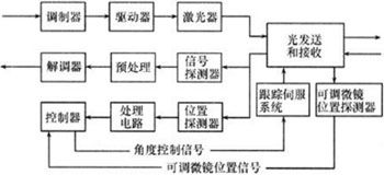 隨著通信技術的發展,對FSO系統的傳輸速率和距離均提出了更高的要求,如果要提高這兩個技術指標,就必須要增大激光器的發射功率和提高接收機的靈敏度,但擴束法和多束法對性能指標的改善有限,于是動態跟蹤法就應運而生,即利用伺服系統通過反饋裝置獲得光束偏差信息,調整可調微鏡,使光束時刻對準接收器。采用動態跟蹤技術的FSO系統設備功能結構如圖3所示,一般采用雙反饋方式,外反饋是位置探測器輸出的入射激光束的位置誤差信號,內反饋是伺服系統控制的可調微鏡的位置信號,入射激光束通過接收光學系統后,聚集到位置探測器上,位置探測器將激光束的位置誤差信號輸出到主處理器。同時可調微鏡位置探測器將探測到的微鏡位置信號送到控制處理器中,控制處理器利用優化的跟蹤算法進行計算,輸出的角度控制信號控制伺服系統調整可調微鏡,使接收光學系統始終對準入射激光束。