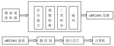 鼠標在人的操縱下移動,微加速度傳感器便會實時地輸出鼠標運動的加速度大小和方向,ADXL203傳感器的量程為±1.7gn ,電壓靈敏度為1000mV/gn,這個電壓信號經過差分放大5.0/1.7倍后,通過微控制器A/D轉換功能變成與加速度大小對應的數字信號,加速度經過兩次積分,便變成了鼠標移動的位移信號,然后,再經過編碼,并通過nRF2401射頻收發器將位移信號發射出去。