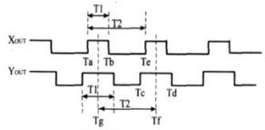 為了實現高精度測量,考慮到T2易受溫度漂移的影響,必須周期性地更新T2的平均值。一種新的改進型脈寬調制(PWM)解碼方法是通過占空比調制在X軸和Y軸使用相同的三角形參考波 ,使得每個周期中 T1的中點達到同步 ,這種方法能加快數據傳輸時間,也稱之為高速解碼,X軸和Y軸的占空比輸出如圖2所示。