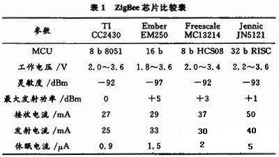 ZigBee技術(shù)是一種近距離、低功耗、低數(shù)據(jù)速率、低復(fù)雜度的雙向無線通信技術(shù),適用于無線傳感器網(wǎng)絡(luò)。目前,多家公司均有自己的主流ZigBee芯片,如表1所示。經(jīng)綜合比較,該設(shè)計選用CC2430芯片,該芯片是Chipcon公司提供的全球首款支持ZigBee協(xié)議的SoC解決方案,它在單個芯片上整合了ZigBee射頻前端、內(nèi)存和微控制器,最大27 mA的工作流耗及在休眠模式下0.9μA的流耗使之非常適合無線傳感節(jié)點對低功耗的要求。