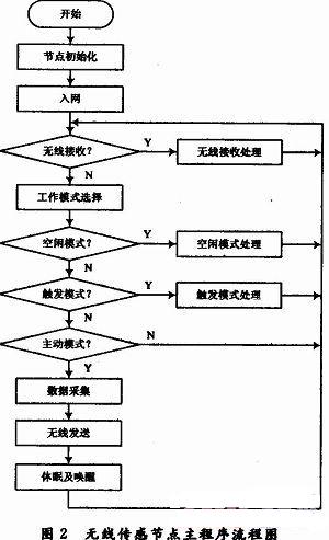 節(jié)點程序主流程如圖2所示,主要包括數(shù)據(jù)采集和無線通信兩個部分。出于傳感節(jié)點低功耗的考慮,軟件設(shè)計重點放在工作模式的處理上。