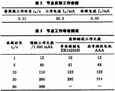 通過測試獲取節(jié)點工作參數(shù)如表2所示,工作電壓為3.3 V。可知,節(jié)點工作時流耗大,在休眠狀態(tài)則小得多。因此,為保證在供電電量有限的情況下獲得更長的工作壽命,有必要將節(jié)點設(shè)置為間歇式工作模式,即工作休眠周期性交替進行。下式為節(jié)點壽命預(yù)測公式: