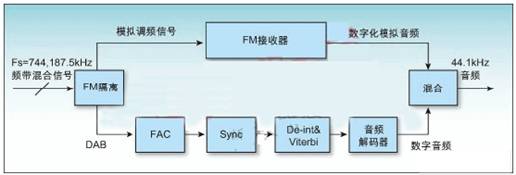 除了去隔行處理和誤碼校正,數字碼流還必須采用iBiquity公司的HD編解碼器(HDC)。同時,如前所述還須并行處理模擬信號。最后,數字化的模擬音頻和數字音頻(來自HDC)混合在一起產生期望的HD無線音頻(見圖2)。