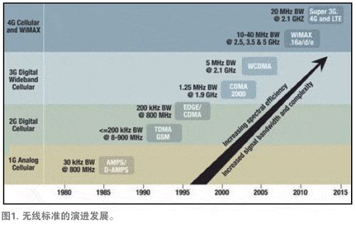 為了解決這一問題,無線提供商轉(zhuǎn)而采用了可提高頻譜效率的無線標準。這類似于將多輛駛往同一目的地的轎車碼放在一輛卡車上,并將卡車沿著高速公路開往目的地。這種方法使相同的高速公路上可以實現(xiàn)更多的數(shù)據(jù)傳輸流量,而不會導致流量降低。為了提高頻譜效率,我們可部署或定義所有的無線標準,其中包括CDMA2000、W-CDMA、TD-SCDMA、MC-GSM、WiMAX以及LTE等。圖1顯示了近年來用于提高頻譜效率所部署或定義的無線標準。