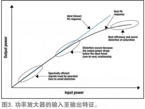 從圖3可以了解PA的工作原理。如藍線所示,理想的PA具有線性或一對一響應。比如,如果提高10%的輸入功率,那么輸出功率也將相應提高10%。而現(xiàn)實世界中PA的性能如黑色曲線所示,PA性能在輸出功率處于極低水平的情況下與理想的PA一致,而在較高的輸出功率水平下則會下降至理想PA之下。例如,如果將現(xiàn)實世界中PA的輸入功率提高10%,其輸出功率僅會提高9%。因此,即使在輸入功率不斷提高的情況下,PA的輸出功率也將停止上升。