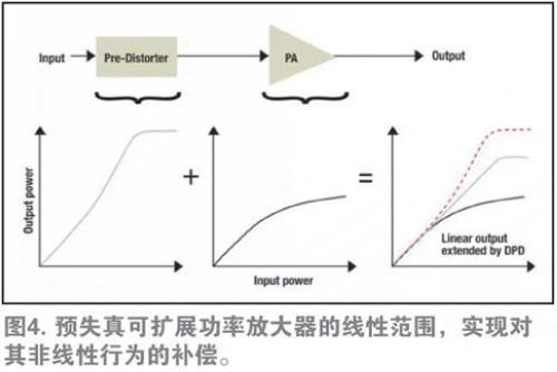自適應DPD可以擴展寬頻帶射頻(RF)PA的直線性能(straight-line performance),而且遠遠超過正常擴展范圍。如前所述,當輸出功率增加時,輸出功率與理想線性性能曲線發(fā)生偏離。這正是PA放大輸出信號出現(xiàn)失真的地方,從而導致信號質(zhì)量下降及干擾。DPD可將PA失真輸出信號與非失真輸入信號進行比較。然后,將輸出信號中一個與失真正好對立的信號添加至輸入,從而有效消除失真。由于DPD可擴展PA的線性范圍,因此將其稱為線性化技術(shù)(如圖4)。