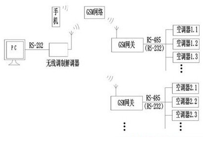 圖中系統可分為4部分;(1) PC(包括一個通過串口連接的無線調制調解器)或手機,通過GSM網絡發送或接收數據;(2)GSM網絡;(3) GSM網關,是PC和家電通訊的橋梁;(4) 網絡家電,可以是網絡空調、冰箱、電熱器具、電動窗簾等(下以空調為例)。
