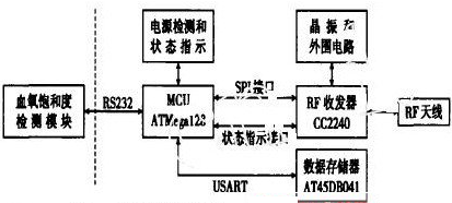 MCU部分是WPAN通信模塊的核心,完成通信模塊各組成部分的控制、協(xié)調(diào)和數(shù)據(jù)的加工。具體功能:通過RS232接口與血氧飽和度檢測模塊通信,實(shí)現(xiàn)對它的控制和配置,并接收檢測數(shù)據(jù);通過SPI接口和狀態(tài)指示接口實(shí)現(xiàn)對RF收發(fā)器的配置和檢測,并完成發(fā)射和接收的數(shù)據(jù)交換;通過USART接口與數(shù)據(jù)存儲器連接,完成數(shù)據(jù)存儲器的讀寫操作;通過電源檢測和狀態(tài)指示部分,監(jiān)測電源電壓情況,并能通過狀態(tài)指示產(chǎn)生報(bào)警提示。