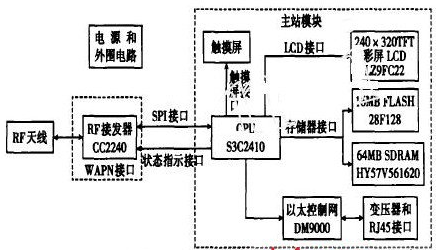 CPU部分完成主站各組成部分的控制、協(xié)調(diào)和數(shù)據(jù)的加工。具體功能:通過系統(tǒng)總線與存儲器相連,完成相關(guān)數(shù)據(jù)的加工、處理和存儲;通過LCD接口與彩色液晶顯示器相連,實(shí)現(xiàn)信息的顯示,以實(shí)現(xiàn)人機(jī)交互;通過觸摸屏接口與觸摸屏相連,實(shí)現(xiàn)控制命令的輸入;通過總線接口與以太網(wǎng)控制器相連,可將檢測儀接入后臺支持網(wǎng)絡(luò),實(shí)現(xiàn)系統(tǒng)信息的集中化管理和與后臺管理系統(tǒng)的融合;通過SPI接口和狀態(tài)指示接口實(shí)現(xiàn)對RF收發(fā)器的配置和檢測,并完成發(fā)射和接收的數(shù)據(jù)交換,實(shí)現(xiàn)與檢測儀移動終端的通信;通過電源和外圍電路,實(shí)現(xiàn)對系統(tǒng)的供電。