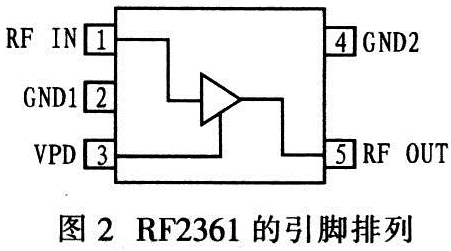 圖2為RF2361的引腳排列,其中:RF IN為低噪聲功率放大器輸入,需通過(guò)一阻抗匹配網(wǎng)絡(luò)達(dá)到50Ω阻抗匹配:RF0UT為低噪聲功率放大器輸出,也需通過(guò)一阻抗匹配網(wǎng)絡(luò)達(dá)到50Ω阻抗匹配;同時(shí)電源VCC給整個(gè)電路提供工作電壓。VPD用于控制偏置電流,與偏置電阻R1共同確定偏置電流。GND1、GND2為接地。