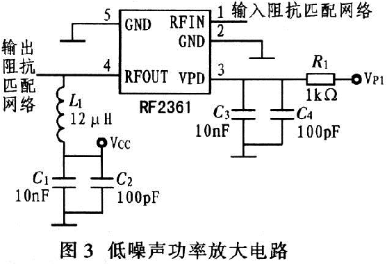 以低噪聲功率放大器RF2361為核心設(shè)計(jì)的低噪聲功率放大電路,如圖3所示,其VPD引腳上的并聯(lián)電容器實(shí)現(xiàn)電源VPD的濾波,RFOUT引腳上的電感電容串并聯(lián)網(wǎng)絡(luò)可對(duì)電源VCC濾波。