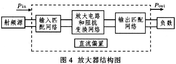 典型的放大器一般包括輸入匹配網(wǎng)絡(luò)、晶體管放大電路、阻抗變換網(wǎng)絡(luò)、直流偏置和輸出阻抗匹配網(wǎng)絡(luò),如圖4所示。確定阻抗匹配網(wǎng)絡(luò)中元件的參數(shù)、類(lèi)型以及連接關(guān)系是實(shí)現(xiàn)匹配網(wǎng)絡(luò)的關(guān)鍵。阻抗匹配是射頻電路設(shè)計(jì)的重要問(wèn)題,其目的是為了實(shí)現(xiàn)能量的最大功率傳輸,提高能量的傳輸效率。