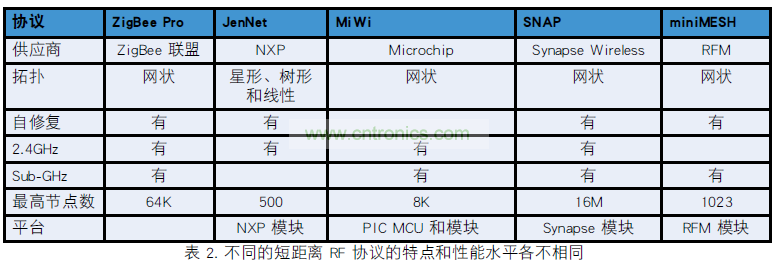 使用芯片制造商開發的專有協議可免去 ZigBee 許可證費(見表 2)。 NXP 提供 JenNet 協議,該協議在 2.4GHz 波段內運行,能組建樹狀、星狀和線性自修復網絡,最高包含500 個節點。 Microchip 的免費 MiWi 堆棧同時以 sub-GHz和 2.4GHz 兩種頻率,在 PIC 微控制器和 Microchip 收發器上運行。