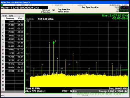 測試1:單輸入信號的中頻信號輸出頻譜測試