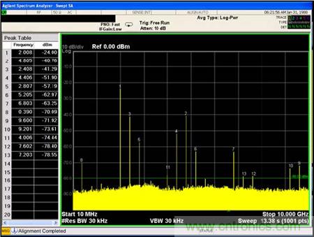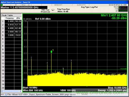 依照圖7所示測試電路,將測試3種不同狀態下從混頻器反射到源端的信號頻譜: