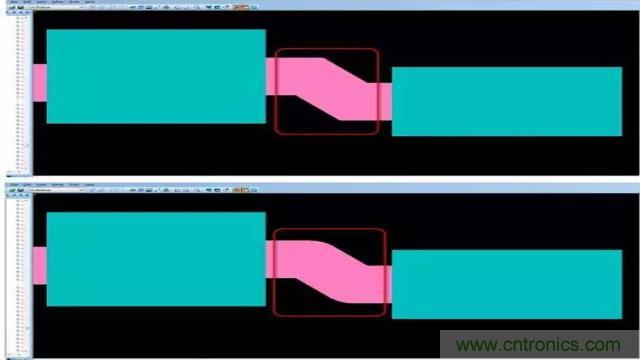 圖2:有效的PCB 設計工具會自動考慮用于繪制形狀的線型,以計算準確的線條寬度,幫助您輕松創建尖拐角。