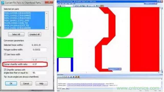 射頻和微波電路中經常用到倒角,以減小饋線與電容器之間的分段不連續性電抗,從而改善MMIC 的頻率性能。90º 拐角與倒角之間的距離至關重要。因此,設計人員需要采用自動方法來基于設計指定需要生成的倒角比率。PCB 設計工具如果能夠基于設計規則自動強制實施需要生成的倒角比率,設計人員和工程師將會從中受益,在節省時間的同時提高設計質量(圖3)。