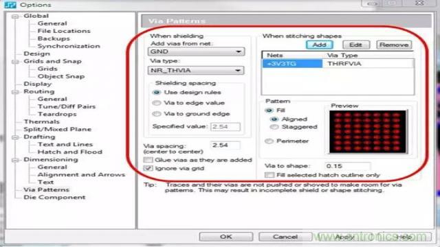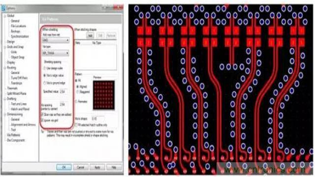 射頻設計的另一個重要方面是確保正確地屏蔽帶過孔的區域。盡管此任務可由設計人員手動進行,但這個過程極其耗時。如果PCB 設計工具能夠自動完成此過程,將可以縮短設計周期時間并確保符合您的所有設計規則。利用此類工具,設計人員可以指定過孔模式生成規則,而將剩余的工作全部交由PCB 設計工具完成。