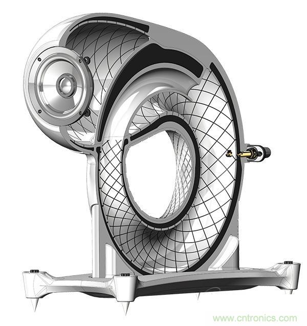 為了不必使用聲波吸收就能夠解決這個問題,畢業于以色列Bezalel藝術與設計學院的工業設計師Boaz Dekel提出了一個非常獨特的解決方案:去掉音箱的后壁。簡單地說,Dekel構思了一個圓形音箱Aleph1。在這個音箱里,向后的聲音會進入“一個永久的自送(self-feeding)回路,以防止它被直接反彈回去,干擾到向前輸出的聲音信號。”Dekel解釋說。