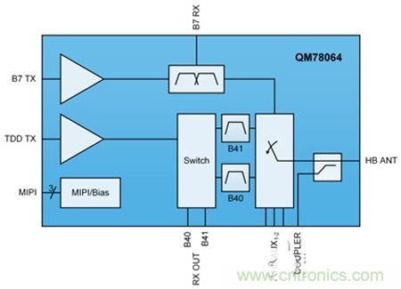 圖 1 所示為 RF Fusion QM78064 高頻段模塊,它同時(shí)支持 FDD-LTE(帶有集成頻段 7 雙工器)和 TDD-LTE(頻段 40 和 41),并搭載一個(gè)支持 20 MHz + 20 MHz 上行載波聚合的寬帶 B41 LowDrift™ BAW 濾波器。該模塊還配備一個(gè)天線開關(guān)并支持包絡(luò)跟蹤 (ET) 和平均功率跟蹤 (APT),以盡可能減少能源消耗。