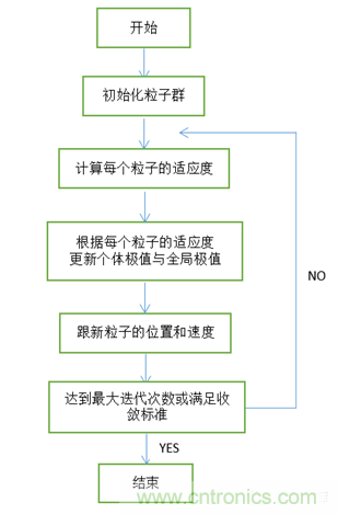 粒子群的基本概念是來自于鳥群覓食行為的研究[3]。與遺傳算法類似,粒子群算法也是一種隨機搜索方法,不同的是,粒子群優化算法沒有選擇、交叉、變異等復雜過程,而是依靠個體間的協作來尋取最優解。每個粒子通過跟蹤粒子本身找到的最優解Pbest和群體找到的最優解Gbest,更新離子的位置和速度,不斷向最優解靠近,最終達到最優解。粒子群算法優化流程圖如圖7所示