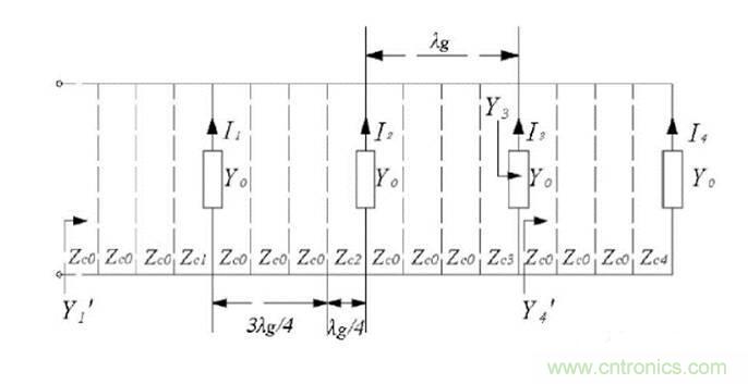 圖中Yo為連接功分網絡的串饋線陣等效導納,Zci為各阻抗變換段的特性阻抗,Zco為饋線的特性阻抗;串饋網絡輸出端口激勵電流與阻抗有如下的關系[4]