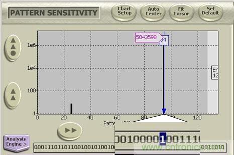 在客戶進(jìn)行誤碼測試的時候,由于鏈路的損耗和芯片的輸出特性,導(dǎo)致出現(xiàn)了誤碼,但客戶卻想知道究竟是哪一個bit位出現(xiàn)了誤碼,以定位誤碼出現(xiàn)的根源。設(shè)置Bert的輸出/輸入端設(shè)置為PRBS7的碼型,在誤碼分析功能里面選擇Patten Sensitivity,則可以直接觀察PRBS7的127個比特的每一位所出現(xiàn)誤碼的個數(shù),看最多誤碼所對應(yīng)的比特位的前后特性,如下圖十三,移動光標(biāo)到任意一個比特上面,可以看到連續(xù)多個0而中間有一個1跳變的bit即127比特的第94比特出現(xiàn)誤碼的個數(shù)最多,達(dá)到5043598個誤碼。從而判斷由于鏈路ISI的影響導(dǎo)致突然的跳變位出現(xiàn)較高的誤碼率。